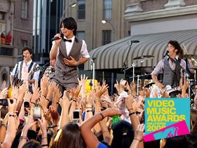 After that, some other stuff happened and Britney drew first blood. A bunch of other people won meaningless awards, Demi Moore looked hot, and then...The Jonas Brothers. I've never heard of the Jonas Brothers before, but from what I understand they're three little Mormon orphans who think they can pray the gay out of their gray vests and clockmaker shoes. They start their cute song off on the steps of some crackhouse in Harlem, which bursts open midsong to reveal a stage where the Brothers Jonas continue their lipsynch/instrument sync with a live band. At this point thousands of rabid JoBro fans rush the show, nearly swallowing the bubble gum popsters in a mixed tidal wave of sexual frustration and enthusiasm only money can buy.