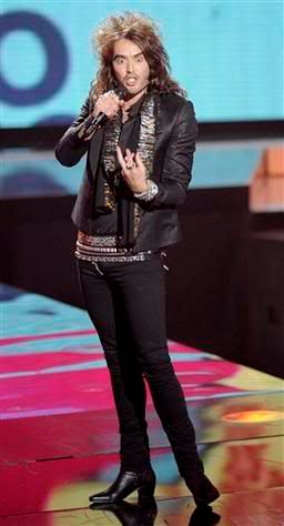 Then Rhianna comes out dressed like a dominatrix, everybody claps, and MTV wheels this coked out British man on the stage, where he then proceeds to make "jokes". The way this guy, known as Russel Brand (and not to be confused with Bertrand Russell), told these "jokes" made it seem as if he had never actually heard a joke be told in 'oll is bluh-y loife'. But then, every time a chocolate cake of epic fail came spewing out of his gob, I would just look at his outrageously horrendous LEGGINGS, punchlines of their own, and laugh myself into a hysterical fit. (Let the record show that after laughing, I promptly vomited.)